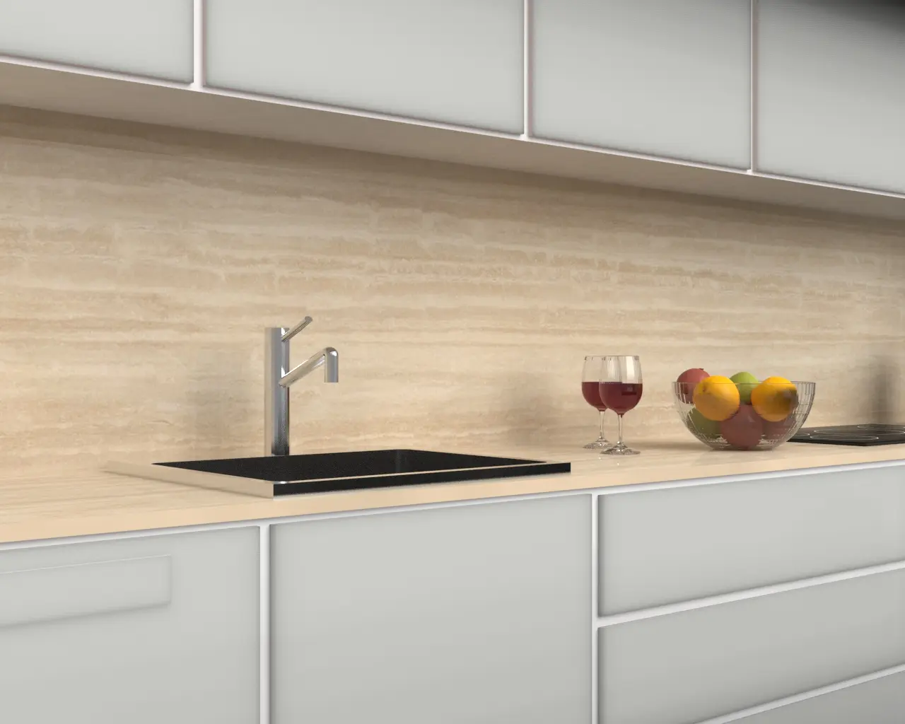 Trawertyn, z tysiącletnią historią, w swoich żyłach i ciepłych odcieniach zawiera w sobie wielkość starożytności. Wydobywany z kamieniołomów w Lacjum, ma unikalną strukturę i pudrowe odcienie, które pozwalają przywrócić dawną rustykalną elegancję, dostosowaną do bardziej współczesnych przestrzeni.