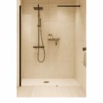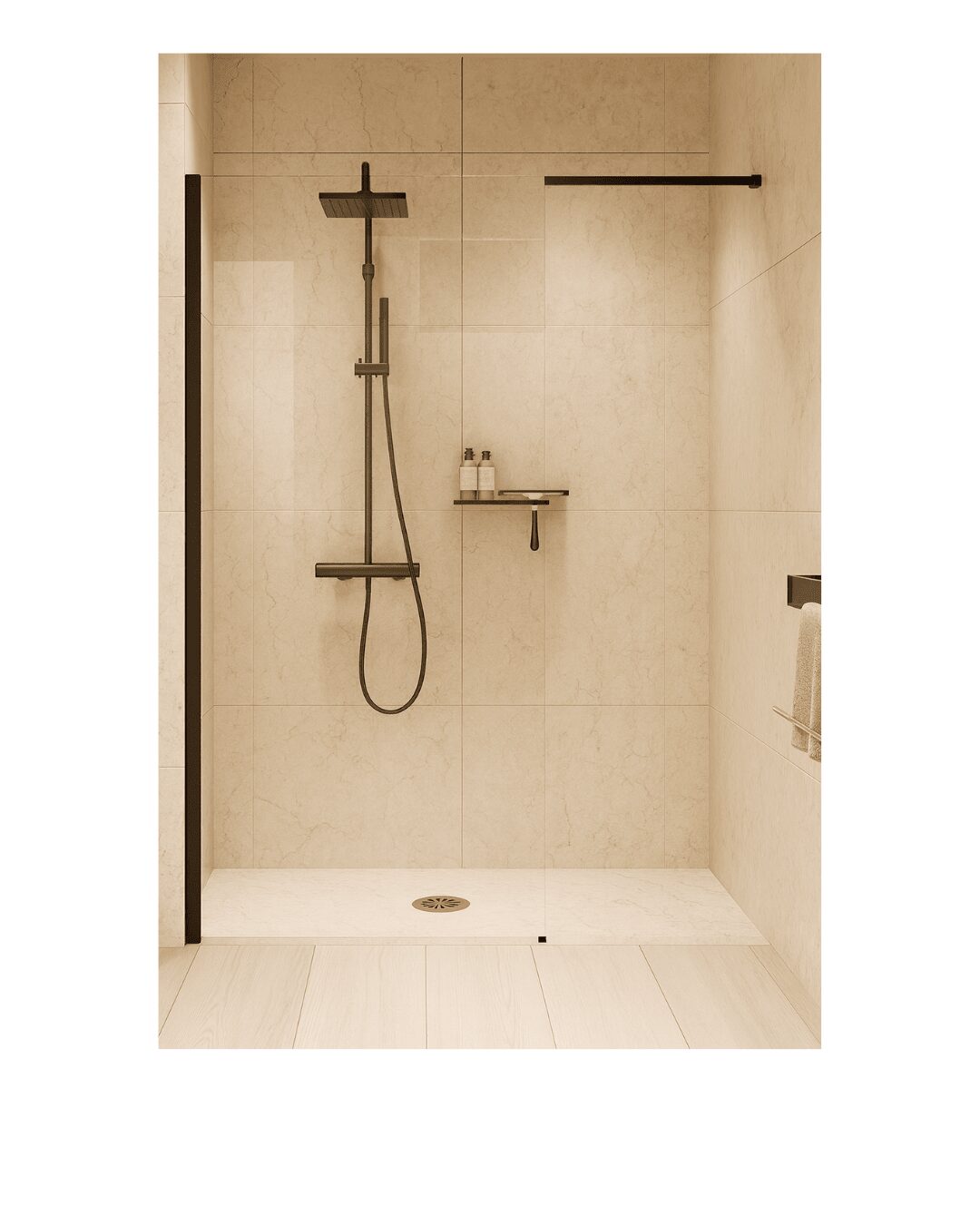 Dzięki brakowi szczelin i kątów, brodzik prysznicowy wpuszczany w poziomie podłogi jest łatwy do czyszczenia. Ponadto, jego prosta forma i wysokość zaledwie 2 cm zapewniają wizualną ciągłość między podłogą a prysznicem, tworząc optyczny efekt większej przestrzeni i przewiewności w łazience.