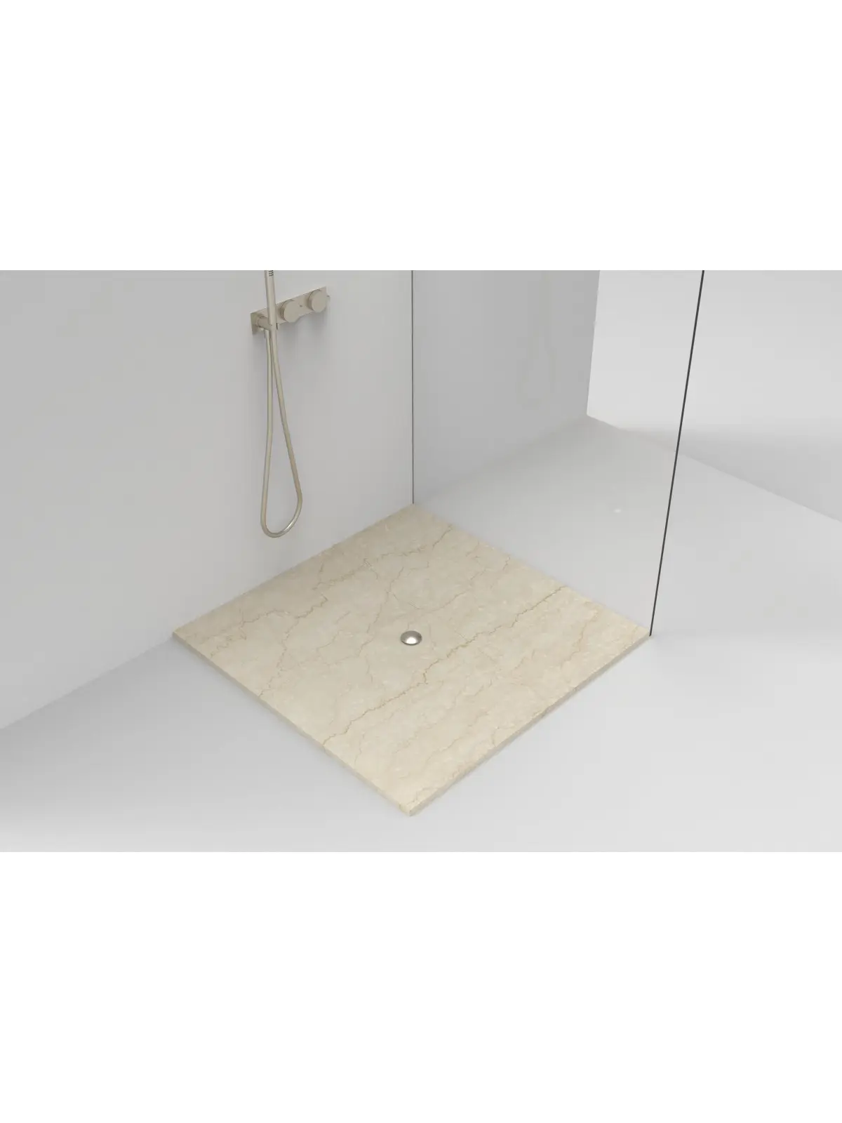 Brodzik prysznicowy wpuszczany w poziomie podłogi wykonany z marmuru Botticino jest idealny dla tych, którzy pragną stworzyć cenną i elegancką łazienkę.